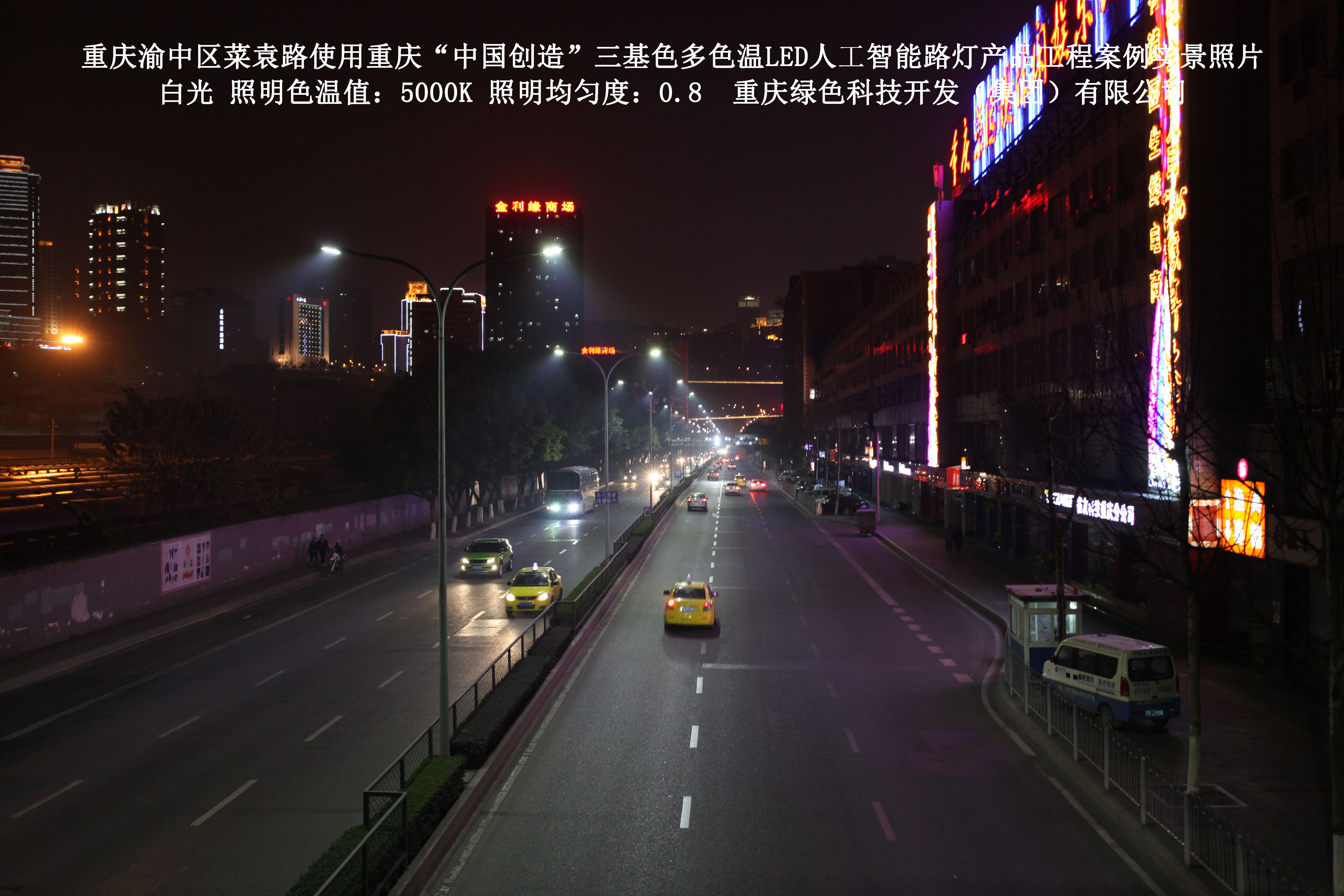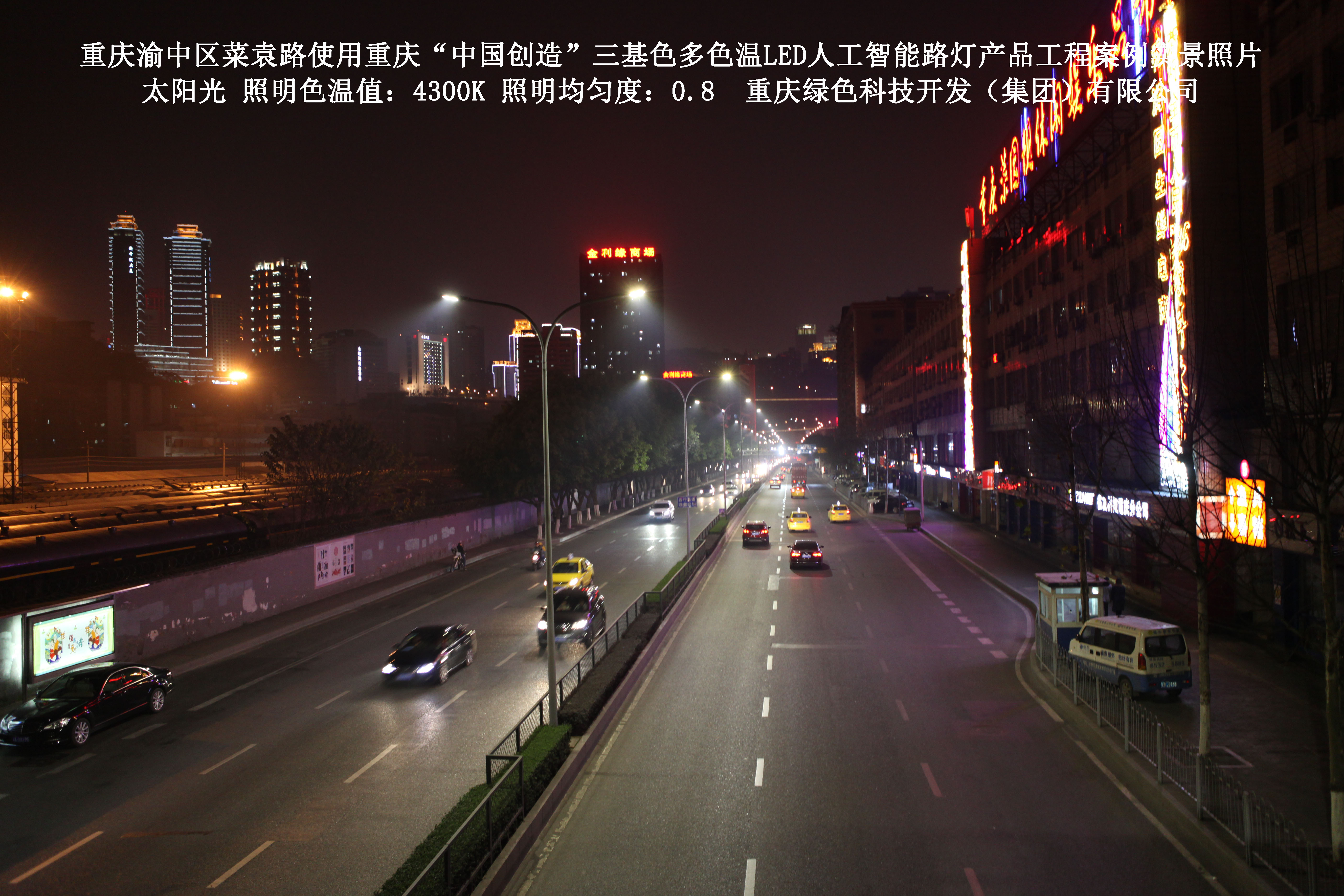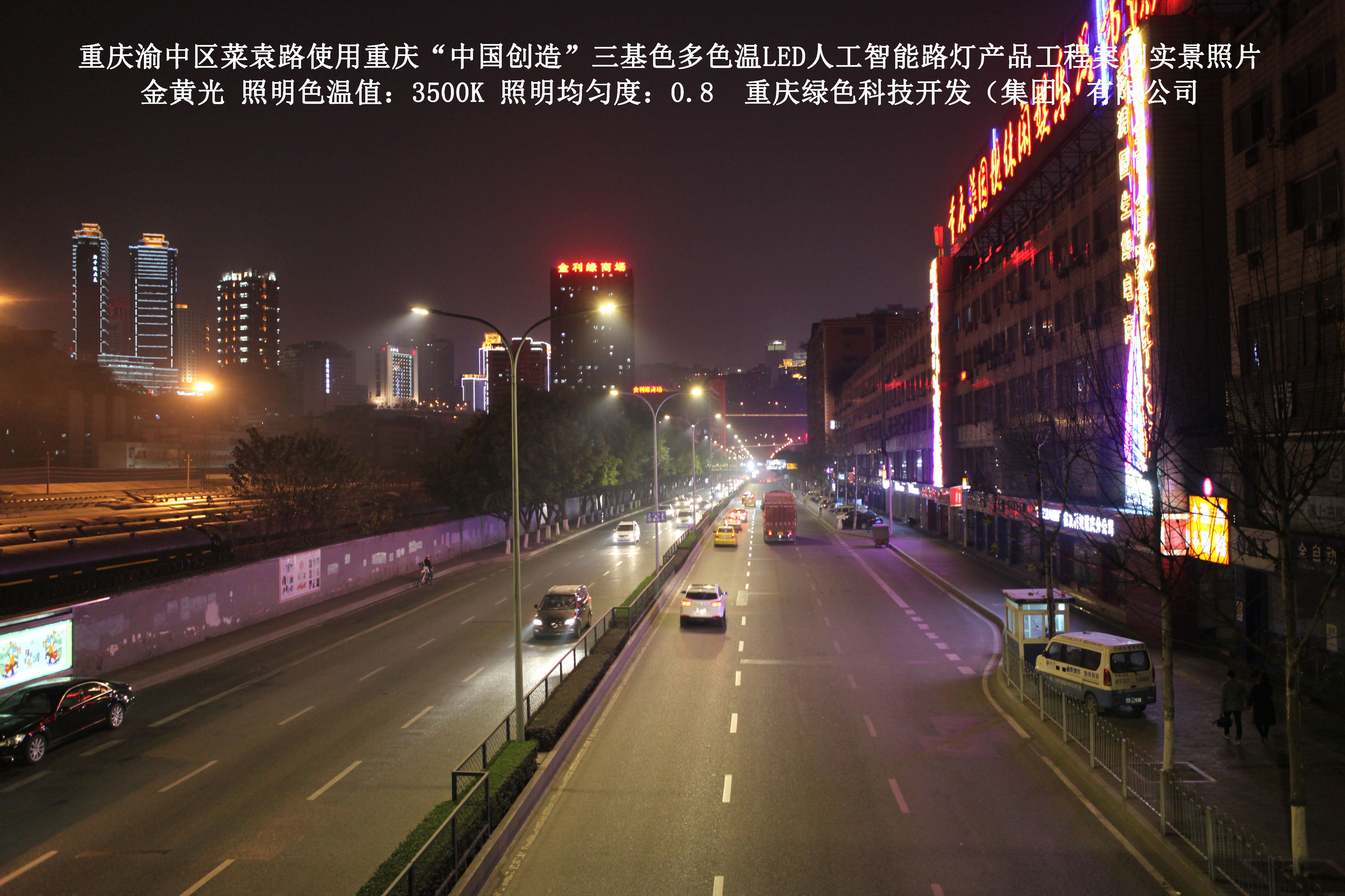 2013年10月,重慶市城市照明管理局使用了我司研發(fā)制造的重慶“中國創(chuàng )造”三基色多色溫LED人工智能路燈,對渝中區菜袁路實(shí)施了綠色照明科技節能改造工程,該工程已全面竣工。工程實(shí)施后,極大地提高了城市照明清晰度、燈光均勻度、舒適度。通過(guò)智能終端實(shí)現單燈感知、線(xiàn)纜防盜報警,與原高壓鈉燈相比,節能率60%以上,有效解決了關(guān)閉控制回路或間隔關(guān)燈方式造成的照明暗區,確保行人和車(chē)輛通行的安全,實(shí)現城市路燈照明系統的智能化管理,推進(jìn)了智慧城市建設。